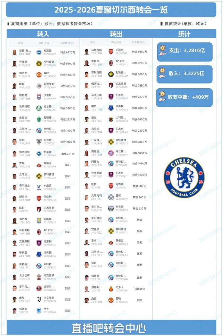 投入3.28亿欧元引进9名球员,出售23名球员赚得3.32亿欧元,切尔西不仅是这个夏窗人员变动幅度最大的英超球队,也是联盟中为数不多既能做好阵容补强,又可以实现盈利的球队,他们已经连续第二年完成了这样的神迹。2024夏窗,切尔西的引援支出为2.39亿欧元,出售球员收入1.98亿欧元,4050万欧元的净投入低于2/3的英超球队,马雷斯卡依靠这班人马完成了英超争四、欧联杯夺冠的任务,世俱杯之旅更是让他们赢得了超过1亿美元的奖金。