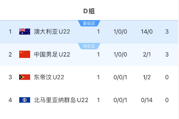 这2场比赛结束后,D组的最新积分为:澳大利亚队和中国队都积3分,但是前者以14个净胜球排名第一,中国队暂时第二名!东帝汶队第三名,北马里亚纳群岛队垫底。